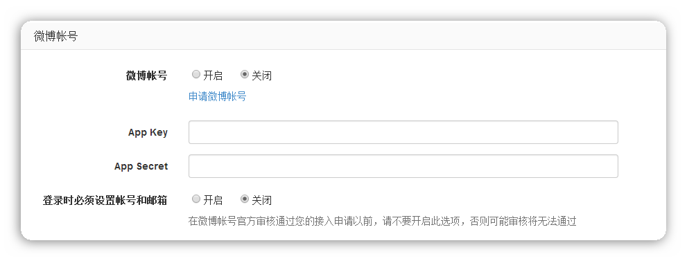 路径:【管理后台】-【系统】-【用户设置】-【登录】-【微博账号】