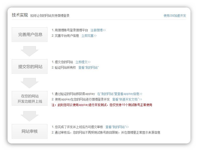 微博审核时间大概一个工作日,一个工作日后,可进入微博开放平台,点击导航的【我的应用】查看申请状态。